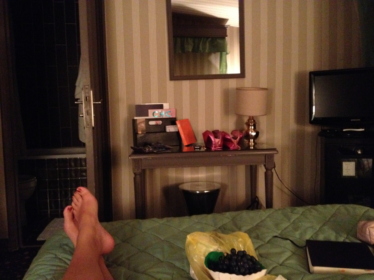 It was a good day; it didn’t measure up to our expectations, but then there we were, ACCIDENTALLY sitting on the wall of Renoir’s home, eating dinner (after 9 hours’ fast) of baguette, cheese, and grapes, all bought from different shops on Rue des Martyrs. And late tonight in bed, a bottle of Bordeaus and a shared pain au chocolat. Our flight arrived two hours late. We couldn’t use our Venture Visa in France, our debit card expired, and we had to walk back to our hotel, famished, because we hadn’t brought our Chase pin to withdraw cash from an ATM.